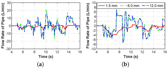 Moreover, the worse road condition, this negative influence is more prominent. When the pipe diameter is 1.5 mm, in the case of the trapezoidal barrier, the EF value once reached 21.25 while the step barrier is only 11.34 at the same traversing speed. This phenomenon can also be seen from the red line in Figure 12b,c that both the angular acceleration value and the vehicle bounce acceleration value have severe fluctuations and shocks. Such large impacts are undoubtedly unacceptable for on-board instruments. The oil flow rate results plotted in Figure 13 shows the oil flow rate of 1.5 mm diameter is significantly less than the 6 mm and 12 mm in both road conditions, which means the pipe cannot function well as a damping unit when the diameter is too small.