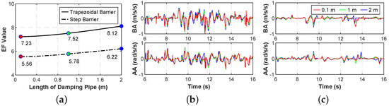 The EF, BA and AA value when traversing the trapezoidal barrier and step barrier with different damping pipe length are presented in Figure 14 in which the pipe diameter is 6 mm and the pneumatic chamber length is 85 mm. The length of the damping pipe will not exceed 2 m due to the limitations of the interior space. As seen in Figure 14a, the increase of pipe length causes slight growth in EF value and weaken ride performance. Nevertheless, the change in EF value is less than 1 in both road conditions, indicating the length of the damping pipe has a limited influence on vehicle ride performance.