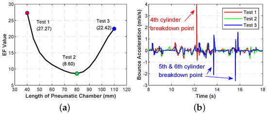 Since the sectional area of the piston is constant, different initial gas volumes mean different pneumatic chamber lengths. The EF value is plotted in Figure 15a for different lengths of the pneumatic chamber, in which the diameter and length of the pipe are 6 mm and 0.5 m, respectively. There exists an optimal length that minimizes the EF value. When the length varies between 50 mm and 80 mm, the increase of the pneumatic chamber length results in a lower EF value, which indicates a softer suspension system can be obtained by increasing the nitrogen volume. However, on the left side of 50 mm and the right side of 85 mm, the pneumatic chamber length significantly influences the EF value.