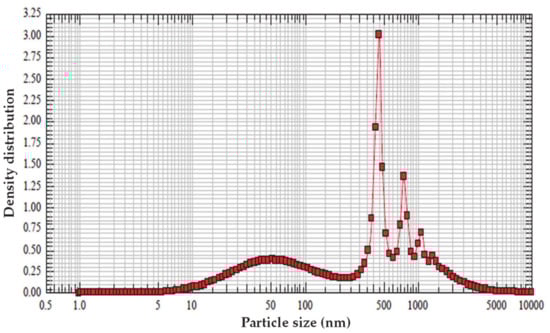 In Figure 2, the interval of the particle size of nanoemulsion chitosan is shown by the DLS device. The results of this analysis indicated that most chitosan nanoemulsion particles had a size ranging from 15 nm to 150 nm. This particle size range is approximately close to the size range of chitosan nanoemulsion particles reported in previous studies [,].