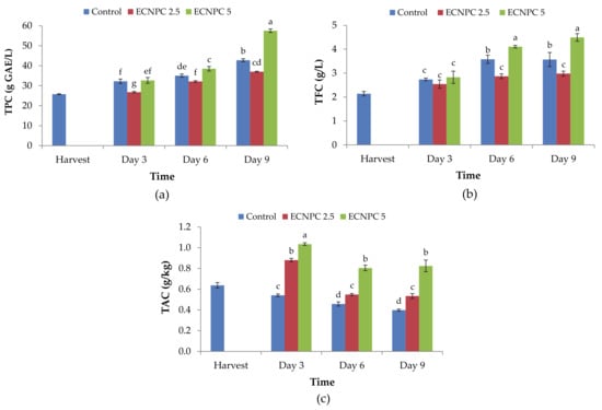 The total flavonoid content of all fruit in all treated and control samples showed an increasing trend during storage. At all evaluation times, the highest total flavonoid content was recorded in fruit treated with ECNPC at 5 g L−1, but the increase in flavonoid content of fruit treated with 2.5 g L−1 was not significant (Figure 3b).
