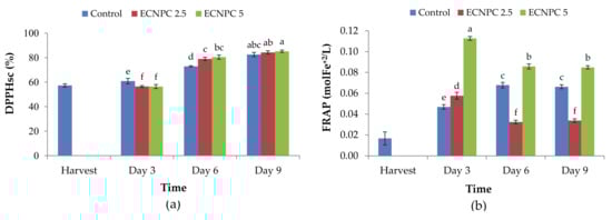Different enzymatic antioxidants are the cells’ weapons against the oxidation of biological molecules such as lipids, proteins, carbohydrates, and deoxyribonucleic acid by free radicals and ROS [,]. The free radicals and ROS are produced during normal cell metabolism and attach the biomolecules of the cells called oxidative damage. To prevent oxidative stress, plant cells activate their antioxidant systems and respond to oxidative damage through the activation of different antioxidant systems []. Our results indicate that the antioxidant capacity, measured with both DPPH and FRAP methods, increases in the fruit treated with 5 g L−1 chitosan nanoemulsion. The use of edible coatings increases the capacity of the fruit antioxidant system and protects the cells against oxidative stress and pathogen attack [,].