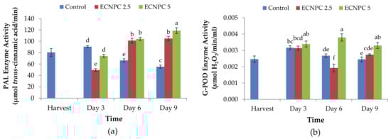 PAL enzyme activity in all treatments, except for the 2.5 g L−1 treatment with chitosan nanoemulsion on the third day, showed an increasing trend in different during storage (p < 0.01). Moreover, the highest enzyme activity (118.88 μmol/min trans-cinnamic acid) among the samples was related to the treatment of 5 g L−1 chitosan nanoemulsion in the ninth day after storage, and the lowest (49.52 μmol/min trans-cinnamic acid) was observed for the treatment of 2.5 g L−1 chitosan nanoemulsion on the third day after storage (Figure 5a).