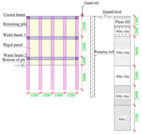 The test foundation pit had the dimensions 6 m × 6 m × 6 m. Considering the high groundwater level, eight dewatering wells with a depth of 10 m and a pipe diameter of 0.5 m were arranged 1.5 m away from the foundation pit boundary. The construction was started after the monitored water level fulfilled the conditions for the excavation of foundation pit. The retaining piles adopted an HW175 section made of steel (Q345), with the dimensions 175 mm × 175 mm× 7.5 mm × 11 mm, a length of 9 m, an insertion ratio of 0.33, and pile spacing of 1.5 m. The retaining piles were connected with rigid panels, which were made of Q235 steel, with the dimensions 6000 mm × 1470 mm and a wall thickness of 6 mm. A crown beam and two waist beams, which were made of an HW175 steel (Q345) section with the same specifications and had a length of 6 m, were vertically arranged in the foundation pit. The retaining piles and the waist beams were fixed by bolts (M20), and water-stop strips were pasted between the retaining piles and the rigid panels for water insulation. A schematic diagram of the field supporting structure is shown in Figure 1, and the profile of the foundation pit is displayed in Figure 2. The physical and mechanical parameters of the supporting structure are presented in Table 2.