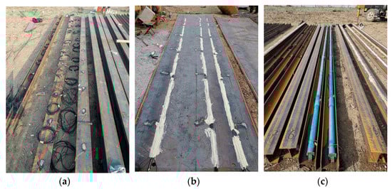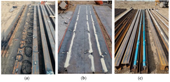 Figure 4a,b show that after the positions of the strain gauges were flattened, smoothed, and polished, the strain gauges were stuck to the retaining piles, the crown beam, the waist beams, and the rigid panels according to the standard operation. Then, epoxy resin and neutral silicone weather-resistant adhesive were coated on the surface of the strain gauges to protect them from scratching. Figure 4c exhibits the inclinometer tube tied and fixed on the retaining piles.