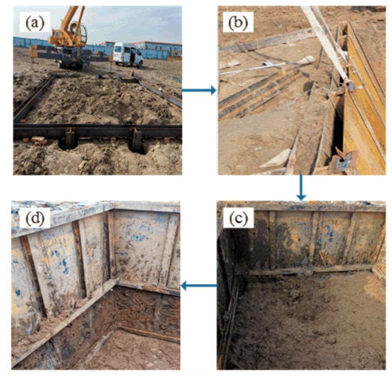 The excavation process of the foundation pit. (a) Implantation of the retaining piles and installation of the crown beam; (b) Insertion of the rigid panels; (c) Excavation of the first layer of the soil and the installation of waist beam 1; (d) Excavation of the second layer of the soil and the installation of waist beam 2.