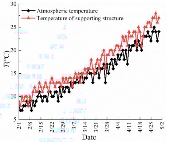 After the excavation of the foundation pit, the original equilibrium state of the soil was destroyed. In order to eliminate the impact of the soil creep characteristics, stress monitoring was carried out one month after the excavation of the foundation pit was completed. The monitoring time was from February to April, when the atmospheric temperature rose from 6 to 24 °C, and the surface temperature of steel varied from 8 to 27 °C, as shown in Figure 6. From 3 February to 8 February, the temperature of the supporting structure was about 10 °C; from 8 March to 15 March, the temperature of the supporting structure was about 15 °C; from 30 March to 5 April, the temperature of the supporting structure was about 20 °C; from 21 April to 25 April, the temperature of the supporting structure was about 25 °C. The average values of the strain and displacement of the supporting structure in the above period were regarded as the strain and displacement at the corresponding temperature.