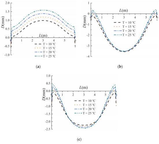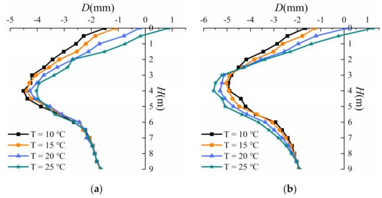 The horizontal displacements of piles 2 and 3 at different temperatures after the excavation of the foundation pit are delineated in Figure 7a,b, respectively; since the monitoring point of pile 1 was damaged, the horizontal displacement of this pile is not presented. The vertical axis represents the length of the pile (H) in meters, and the horizontal axis indicates the horizontal displacement of the pile (D) in millimeters. The positive sign implies that the direction of the horizontal displacement is outward along the foundation pit, and the negative sign denotes the reverse direction.