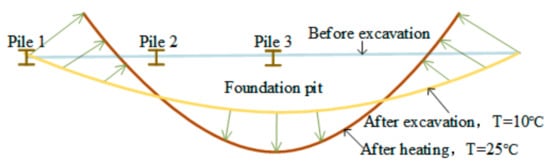 - Under the action of the thermal stress, the horizontal displacement of the retaining pile above the excavation face was more prominent. The deflection of waist beam 2 increased with the temperature rise, which made the deformation of retaining pile 3 consist of rigid rotation and flexural deformation, while retaining pile 2 only experienced flexural deformation.
