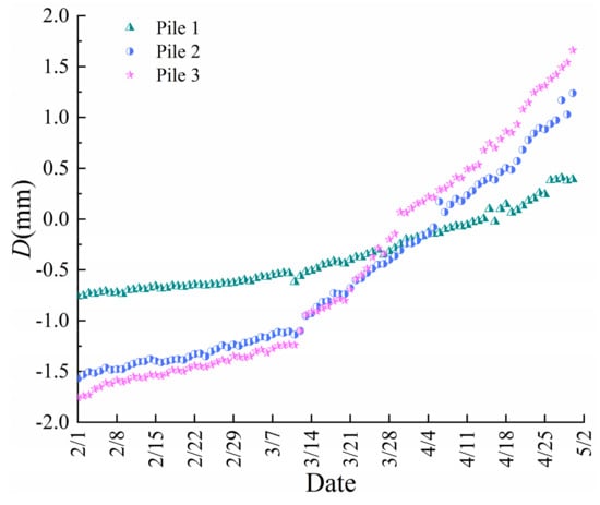 The horizontal displacement of the pile crown is an important index of characterizing the safety of the supporting structure. The variation in the horizontal displacement of the pile top with the time measured on site is delineated in Figure 9. It is not difficult to find that the pile crown was displaced into the pit at the initial stage of the excavation, and pile 3 was located in the middle of the foundation pit, which led to the maximum displacement, thereby showing an obvious time-space effect. In the subsequent heating stage, the pile crown was displaced to the outside of the pit, and the horizontal displacement of the pile crown was highly consistent with the trend of change in the temperature. By the end of monitoring, the horizontal displacement of the crown of pile 1, 2, and 3 increased by 1.15, 2.81, and 3.42 mm, respectively. It can also be seen that the pile in the middle of the foundation pit was most affected by the temperature. It was noted that before mid-March, the horizontal displacement of the pile crown enlarged slowly with the temperature. After mid-March, the increasing rate of the horizontal displacement of the pile crown rose with the temperature because the rate of the local temperature rise increased; however, the daily temperature difference declined after mid-March, which led to the increase in the horizontal displacement rate of the pile crown.