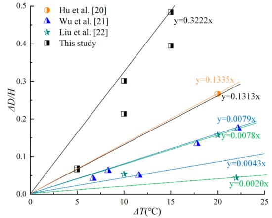 In Figure 10, the horizontal axis represents the temperature difference (ΔT), and the vertical axis denotes the ratio of the increment in the horizontal displacement caused by the temperature variation to the excavation depth (ΔD/H). Hu et al. [] analyzed the stress on, and the deformation of, the diaphragm wall of a foundation pit by a numerical simulation. Their results showed that the slope of the curve of ΔD/H versus ΔT was 0.1335. The slope was large, which might be due to the large excavation section of the foundation pit and the wider temperature influence range. Wu et al. [] and Liu et al. [] derived the calculation formula correlating the temperature variation with the displacement of the support structure, and demonstrated that the slope of the curve of ΔD/H versus ΔT ranged from 0.0043 to 0.0079 and from 0.0020 to 0.0078, respectively. The growth rates were too small because the method simplified some important factors in practical engineering. In this paper, the slope of the curve of ΔD/H versus ΔT was in the range of 0.1313 to 0.322, which is obviously larger than the one reported by other scholars. The reason is that the foundation pit in this work used steel H-section beams and rigid panels as the supporting structure, and the temperature variation had a more significant impact on the whole supporting system. Therefore, close attention should be paid to the safety of the steel supporting structures in areas with a high temperature difference.