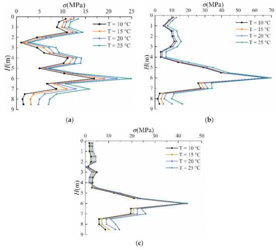 The stress–temperature relationship of (a) pile 1, (b) pile 2, and (c) pile 3.