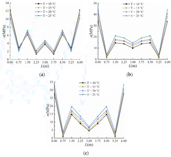 The stress variation law of each measuring point in Figure 15c is basically similar to that in Figure 15b. When the temperature rose from 10 to 25 °C, the stress values on points F1–F5 increased by 5.79, 2.89, 4.93, 4.51, and 2.37 MPa, respectively, which were all smaller than the corresponding increments in stress on waist beam 1. Hence, waist beam 2 was not so severely affected by the temperature as waist beam 1. The analysis confirmed that waist beam 2 was deeply buried and shortly had a short-time exposure to sunlight, so it was less affected by the temperature compared to waist beam 1.