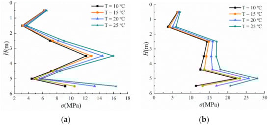 Figure 17b is basically similar to Figure 17a. After raising the temperature to 15 °C, the stress on points H1 and H7 increased by 0.68 and 9.34 MPa, respectively, corresponding to an increment of 11% and 82%, respectively. The increment in the stress on rigid panel 2 was slightly larger than that in the stress on rigid panel 1. The analysis confirmed that the deformation of rigid panel 2 was larger than that of rigid panel 1 because it was closer to the middle of the foundation pit, which led the stress on rigid panel 2 to increase more rapidly.