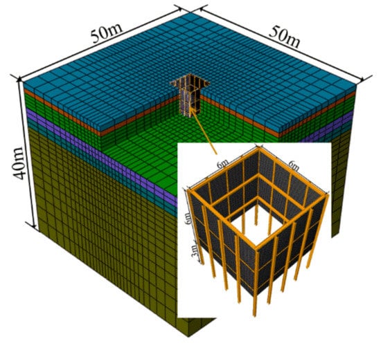 Considering that the influence of the length and width of the foundation pit was three to five times that of the depth of the pit in the model [,], the length and width of the foundation pit were set at 50 m, and its depth was set at 40 m. The modified Cambridge model was adopted for the soil, and the parameters of the test site given in Table 1 were used for the soil layer. In order to improve the accuracy of the calculations, the soil within and around the foundation pit was processed by grid encryption, while the grids far away from the foundation pit were processed by transition; also, the grid size gradually increased from the inside to the outside of the foundation pit. The grids adopted C3D8R elements with hourglass control. The displacement of the bottom of the soil in the three directions and the normal displacement around the soil were restricted. Because the mechanical properties of the soil were not almost affected by the temperature, the effect of the temperature on the soil was not taken into account to simplify the calculations. The structure of the calculation grids of the soil is depicted in Figure 18.