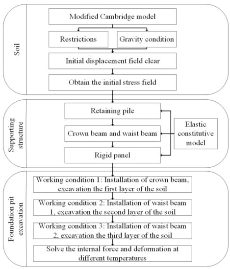Since steel was much more affected by the temperature than the soil, only the coefficient of thermal expansion of the retaining piles, the crown beam, the waist beams, and the rigid panels was defined when setting the material parameters. Then, an analysis step of the temperature was created in the analysis step manager, and the temperature of the supporting structure was maintained constantly during the excavation of the foundation pit. Finally, after the excavation of the foundation pit, the field was predefined by changing the specified temperature in advance [].
