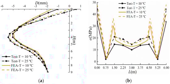 In order to verify the accuracy of the finite element model, the measured and simulated values of the horizontal displacement of pile 3 and the stress on waist beam 1 at a temperature of 10 and 25 °C were extracted and compared, as shown in Figure 20a,b, respectively.