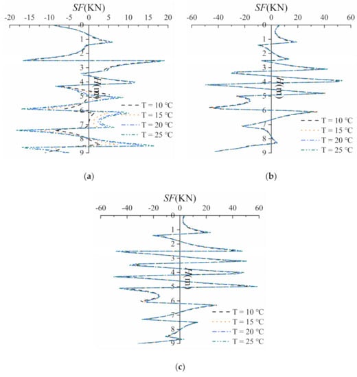 The shear force (SF)–temperature relationship of (a) pile 1, (b) pile 2, and (c) pile 3.