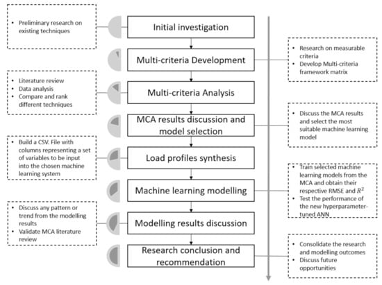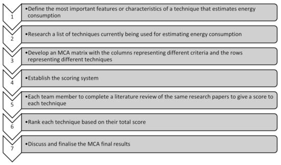 A MCA to choose the most suitable machine learning technique for estimating energy consumption in a residential building is an evaluation process that considers different measurable criteria to rank, compare, and select the best performing models considered in the literature. A list of benchmarks is identified to evaluate the identified techniques’ performance and measured either qualitatively or quantitatively. The MCA was established by following the procedure shown in Figure 1, the set of chosen criteria are listed in Table 1.