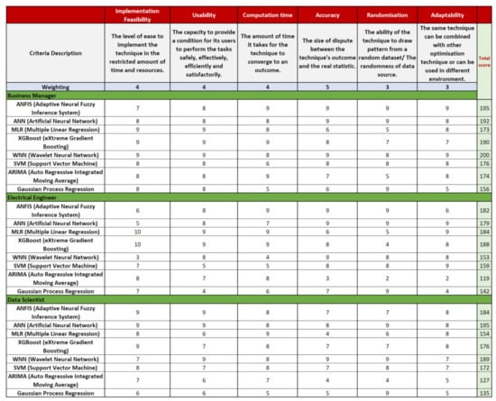 There are six main analysis criteria considered in this study, each with different weighting depending on their relative importance to the study’s objectives. In this study, accuracy is assumed to have the highest weightage because it aims to identify the most accurate predictive method for estimating residential buildings’ energy consumption. A rating from 1 to 10 is applied to each criterion, with a higher value representing a favourable outcome. Each technique will be ranked according to its MCA score, where the higher the score, the more suitable the approach fits for purpose. Furthermore, the MCA was done with three separate sets of scoring systems for different perspectives of business managers, electrical engineers, and data scientists to ensure the final result is not biased to one specific area. The three scoring systems used the same papers from the literature review, with the final scores being the average of the individual scores.