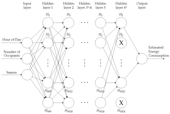 In general, machine learning models work with the dataflow of taking in input features, extracting a relationship with the input feature and the output label, and predicting the future. In our proposed model, the input features of occupancy rate, seasonality, and datetime are given to the deep neural network model as input features. The deep learning models output is essentially the estimated value of energy consumption as illustrated in Figure 5. As indicated in the previous section, the synthetic load generator was used to generate the dataset in this pattern, and then the full set of data was then fed into the proposed deep learning model. The learning requires two stages, the training stage to create the prediction model and the testing stage to verify the prediction model’s prediction performance.