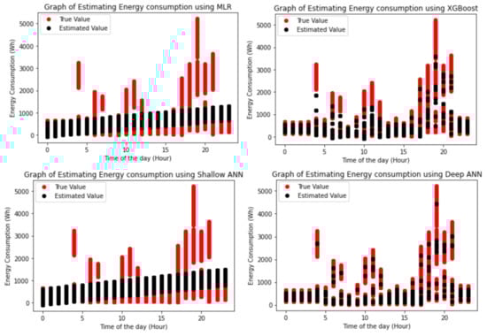 Finally, we use root mean squared error (RMSE) and coefficient of determination () to evaluate the models created. The RMSE produces an average difference between the estimated value and the actual value. The desired RMSE value is to be as small as possible to indicate the predicting model is accurate. On the other hand, the indicates how closely the model can follow the expected estimate of energy consumption value in percentage. The value is desired to be as close to 100% as possible. The proposed deep ANN model is compared with the baseline models of XGBoost, MLR, and shallow ANN. The inferences from this evaluation are discussed in detail in the results and discussions section below.