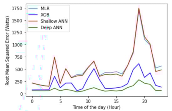 The line graph in Figure 9 reveals a better visual representation of all models’ performance. The deep ANN model achieved the highest accuracy of all the techniques examined in this study, indicated by the fact that it had the lowest RMSE curve compared to the rest. The increased accuracy is due to its ability to model the randomness in the model and deal with input noises, unlike linear regression methods, which are only suited for linear modelling. The XGB models are also susceptible to noisy data, evident from the accurate prediction results obtained. However, despite performing well in predicting energy consumption values, deep ANN took a significant longer computation time (2738 s or 45 min and 38 s) to build the model compared to 4 s and 28 s for MLR, XGB respectively. Based on the accuracy required and computational availability, the type of prediction model is chosen.