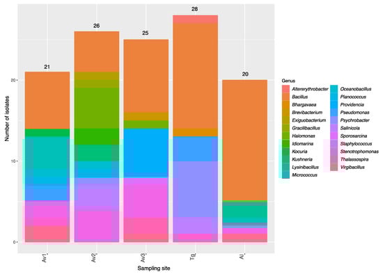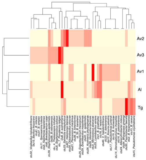 Cluster analysis based on a heatmap of OTU abundances (Figure 2) indicated a closer clustering of Av1, Al and Tg subsets. Although one OTU (OTU 8), identified as Bacillus australimaris, was found in all sampling sites, most of the OTUs were unevenly represented in the different sampling sites, and most of them were restricted to one particular sampling site (Figure 2; Appendix A, Figure A4). Kocuria sp. (OTU 12), Virgibacillus dokdonensis (OTU 22), V. halodenitrificans (OTU 40) and Pseudomonas juntedi (OTU 17) were represented only in the Av1 subset. Genera Exiguobacterium (E. mexicanum; OTU 25), Kushneria (K. phyllosphaerae; OTU 26), Idiomarina (I. loihiensis; OTU 28) Gracibacillus (G. massiliensis; OTU 29), Halomonas titanicae (OTU 27) and B. licheniformis (OTU 36) were represented only in the Av2 subset. Isolates identified as Thalassospira lohafexi (OTU 4), Brevibacterium casei (OTU 6), Providencia rettgeri (OTU 7), Sporosarcina luteola (OTU 11), Bacillus infantis (OTU 41), Bacillus simplex (OTU 37), Halomonas taeanensis (OTU 5) and Staphylococcus xylosus (OTU 9) were found only in the Av3 subset. The species Altererythrobacter indicus (OTU 24) and Bhargavaea ginseng (OTU 34) were found exclusively in site Tg, and OTU 33, identified as Lysinbacillus varians, was exclusive to Al.