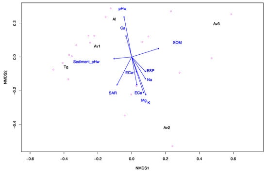Sediments of the five sampling sites were all strongly saline (Table 1) but differed greatly in their salinity levels, pH, sodium-related parameters like SAR and ESP, concentration of exchangeable cations and organic matter content (Table 1). Although soil salinity has been shown to decrease bacterial diversity in rhizospheres [], in this study, the greater diversity of culturable halotolerant bacteria associated with the roots of S. ramosissima was observed in the most saline sediments of Ria de Aveiro saltmarshes (Av1 and Av2). The lowest diversity was found in the subset of isolates retrieved from the southernmost site (Al), on the southern Atlantic coast (Algarve), where the salinity indicators were the lowest. The plants collected from this site already had their color changed from green to red, indicating that they were either experiencing abiotic stress or senescence. This could explain the lower taxonomic diversity of the cultivable bacterial community found at this site. Salinity, however, seems to be neither the sole nor even the most relevant determinant of the diversity of isolated halotolerant bacteria. NMDS analysis (Figure 3) indicates that the composition of the subsets of PGP bacteria corresponding to different salt marshes within the same estuarine system (Ria de Aveiro) was related also to different sediment parameters. Neutral pH is more strongly related to the composition of Av1 and Tg subsets. The overall concentration of exchangeable cations and the parameters determined for soil sodicity (SAR and ESP) seemed to influence the bacterial composition in Av2, and the higher content of organic matter determined bacterial diversity in Av3. As a consequence of the effect of different sediment properties, there was a significant variability in the composition of the sets of isolates obtained from plants growing in different sites. In fact, the structure of the subset of isolates from site Av1 was more similar to the subset corresponding to geographically distant saltmarshes (Al and Tg) than to the other two sites of the estuarine system of Ria de Aveiro (Figure 2; Appendix A, Figure A1), which confirms that site-specific factors related to sediment properties may have a major impact on the outcome of the culture-dependent approaches used to prospect the microbiome of halophyte species for bacteria with PGP potential.