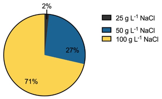 The possibility of using rhizosphere and endosphere bacteria as biostimulants for saline agriculture or as saline-stress attenuators for salt-sensitive crops has been the motivation for many culture-dependent analyses of the microbiome of halophyte species. Salinity tolerance is a requirement of PGP bacteria used for the attenuation of saline stress. In the overall collection of isolates, 71% were able to grow at a salinity corresponding to 100 g L−1 NaCl. This result demonstrates the potential of halophyte plant microbiota to harbor bacteria adapted to high salinities [].