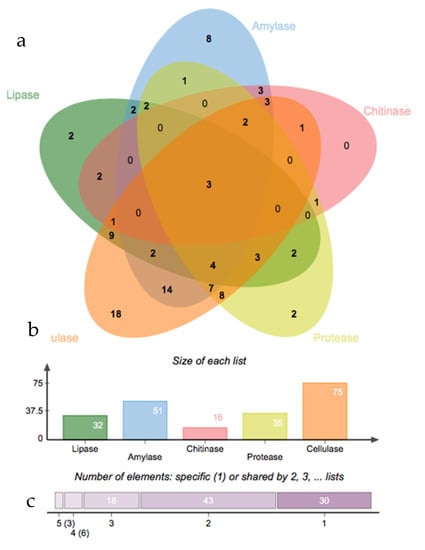 Number of isolates expressing different extracellular enzymatic activities (a); number of isolates expressing each extracellular enzymatic activity (b); number of isolates combining the expression of 1, 2, 3, 4 or 5 different activities (c).