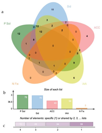 Number of isolates expressing different plant-growth promoting traits (a); number of isolates displaying each plant-growth promoting trait (b); number of isolates combining the expression of 1, 2, 3, 4, 5 or 6 plant-growth promoting traits (c).