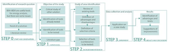 The research was conducted in several steps. In the first phase, some of the most common new design tools and the most recent standards for energy analysis were studied. From this first analysis, it was possible to list the disadvantages and the advantages. Once a tool was selected that matched the required characteristics, it was validated using a simple building. Then, an existing building was chosen as a case study to apply the energy analysis methodology in a BIM environment. It was defined through the application of a test model. Figure 1 shows the workflow diagram.