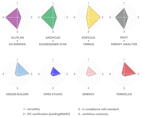 Each figure represents a tool. The vertexes are four main characteristics: Versatility, compliance with the standards, certification, and the “workflow-continuity”. This latter identified the advantage of not having to open another software to conduct energy analysis. It leads to less interoperability since the changes made to the BIM will not be directly reported in BEM. The value related to the “versatility” was associated according to the number of features available (e.g., Open Studio has 3/5 features, so the value of its versatility is 0.6). The value related to the “compliance with the standard” was calculated according to the number of standards complied with, e.g., Allplan + AX-Energia complies with 1/3 standards, so the value is 0.33. The value of the certification is equal to 1, if the tool is certified, and 0 if it is not certified. The value of the workflow-continuity is equal to 1, if the tool has this characteristic, and 0 if it does not.