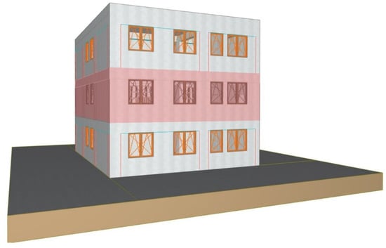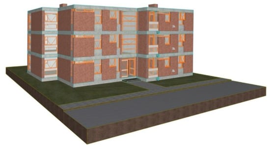 The construction of the BIM model was carried out using the construction components and materials already present in the program library. In this way, possible conflict situations were avoided to better control the process. Figure 3 shows the three-dimensional view of the building with the apartment examined in evidence.