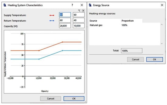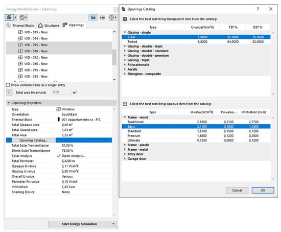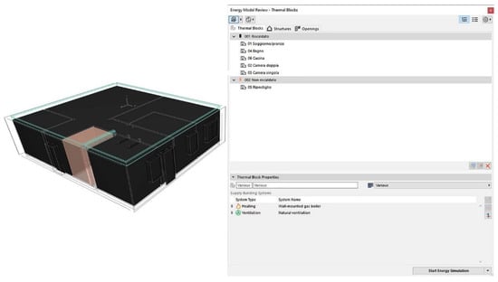 Revit [27] is one of the most popular BIM software, both for its performance and for its compatibility with other programs widely used in the construction sector (also produced by Autodesk). It must be specified in this regard that Revit has not developed great connectivity with software that is not part of the Autodesk suite. It is possible to find compatibility problems even if almost all manufacturers try to interface as much as possible with Revit. Energy diagnosis is allowed through an additional module, Energy Analysis, which integrates the design features of Revit with the analysis features of Autodesk Green Building Studio, an independent cloud service for energy diagnosis based on the DOE-2.2 simulation engine [25] (which complies with the ASHRAE 140-2007 [32] standard).