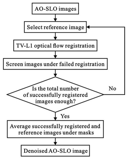 The human eye has a limited resilience to light exposure. Therefore, to prevent optical damage, the light of AO-SLO imaging should be set to a low-power mode. However, low light might lead to a low signal-to-noise ratio in AO-SLO images. To increase this ratio, multiple registered AO-SLO images can be averaged. To this end, we adopt TV-L1 optical flow estimation [37] for image registration and then average the registered images after screening. The flowchart of image denoising based on registered images is shown in Figure 2. First, the middle image in a time sequence is selected as a reference for the registration of other images. Then, TV-L1 optical flow registration is applied to each image to be registered. Third, image registration is evaluated. Registered images whose structural similarity index [40] with respect to the reference image is below 0.5 under masks are discarded. If the number of remaining registered images is below one-fifth of the number of acquired images, the algorithm selects the next image closest to the middle in the time sequence as the new reference image. When the number of successfully registered images is sufficient, they are averaged along with the reference image under masks to obtain the denoised AO-SLO image.
