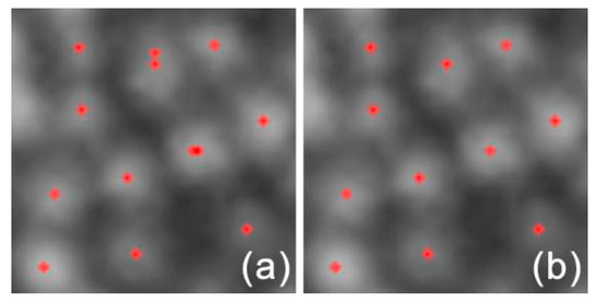 Duplicate identification removal. Identified cone cells are marked in red on the denoised AO-SLO image patch (a) before and (b) after duplicate identification removal.