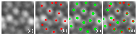 Cone cell dentification based on threshold segmentation. (a) Denoised AO-SLO image patch. Identification results from (b) the method in Section 2.4 (red dots), (c) threshold segmentation (green dots), and (d) both methods on the denoised AO-SLO image patch.