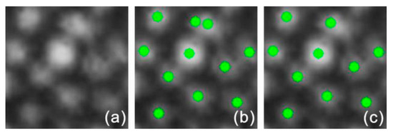 Merging of closed identified cone cells. (a) Denoised AO-SLO image patch. Identification results (b) before and (c) after merging (green dots) on the denoised AO-SLO image patch.