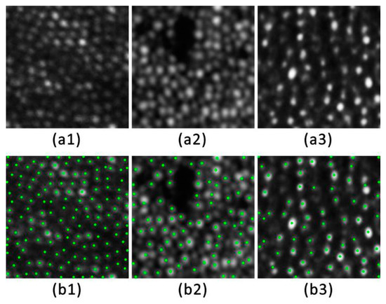 We further evaluated the performance of the proposed method on different types of AO-SLO images. Figure 10 shows three examples of AO-SLO images [43,44] and their corresponding cone cell identification results. The first example (Figure 10(a1,b1)) shows an AO-SLO image at different retinal locations in the same healthy eye with cone cell density below that of the examples shown in Figure 9. The examples in Figure 10(a2,b2) and Figure 10(a3,b3) show AO-SLO images of an eye with diabetic retinopathy [43] and an eye with acute zonal occult outer retinopathy [44], respectively, along with the corresponding cone cell identification results. The proposed method accurately identifies AO-SLO images of eyes with low cone cell density, diabetic retinopathy, and acute zonal occult outer retinopathy.