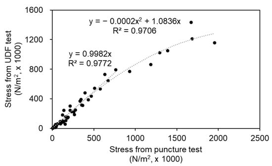 A total of 59 commercial food samples were selected and then subjected to both UDF and puncture tests. Figure 3 presents the stress values of the food samples measured by the UDF and puncture tests. A fairly linear correlation (y = 0.9982x, R2 = 0.9772) was observed between the two tests for the samples with the stress values lower than that of the starch gels tested in this study (8 × 105 N/m2). On the other hand, when the stress values became higher, the relationship between the UDF and puncture tests was well-fitted to the quadratic polynomial model (y = −2 × 10−4x2 + 1.0836x, R2 = 0.9706).