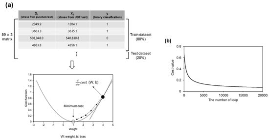 Several previous studies have classified foods for the elderly based on rheological measurements. The Japan Care Food Conference [] and Korean Industrial Standards [] reported that the upper stress limit of the foods for the elderly was 500,000 N/m2. In addition, Kim et al. [] compared instrumental and sensory measurements of foods for the elderly, suggesting the stress range lower than 500,000 N/m2. Thus, machine learning analysis was applied for identifying foods for the elderly based on the stress values (500,000 N/m2). Figure 4a shows the overall procedure of gradient descent-based machine learning algorithm. The datasets consisted of a 59 × 3 matrix containing the stress values obtained from UDF/puncture tests and binary values where 1 (yes) and 0 (no) indicate that the sample satisfied and did not satisfy the rheological criteria of foods for the elderly, respectively. A matrix multiplication on the inputs (x) and weights (W) was performed, and a bias (b) was added to the weighted sum. A gradient descent algorithm was then used to minimize the cost function whose partial derivative was iteratively computed to obtain the most appropriate model []. By successive iterations, the gradient descent algorithm converged to a point where the derivative of the cost function, that is, a curve slope at a point was close to zero (Figure 4a). Consequently, it provided the optimal parameters for the models by approaching the minimum of the cost function. Figure 4b shows the plots of cost function versus the number of iterations. The cost function of the binary logistic model was reduced by successive iterations and became stable.