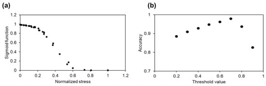 As one of various machine learning algorithms, the binary logistic regression model has been used to predict binary responses based on one or more predictor variables. Specifically, this algorithm has played a critical role in developing a spam email filter []. In the binary logistic model, a model is trained to make a binary decision about a new input observation. For doing so, the difference between predicted and experimental values is considered over the whole training dataset for training to validate the performance of the established model []. It is noted that the data in the binary logistic regression model are classified into two categories such as 1 (yes) and 0 (no) depending on the classification threshold. Thus, in this study, the binary classifications were applied in order to indicate whether food products belonged to the elderly’s foods (lower than 500,000 N/m2) or not (higher than 500,000 N/m2) [,]. As illustrated in Figure 5a, the binary logistic regression had a characteristic S-shaped curve through the sigmoid function. In the binary logistic model, the optimal value of the threshold needs to be decided during the training in order to maximize the model accuracy []. Thus, in this sigmoid curve, a classification threshold was defined in order to map the logistic regression values to a binary category. After training the logistic model with the training datasets, the predicted classifications of the testing datasets were compared with the experimental ones. Figure 5b shows the accuracy of the binary logistic algorithm depending on threshold values ranging from 0.2 to 0.9. When the threshold value was 0.2, the accuracy was determined to be 0.8855. The accuracy had a distinct tendency to increase with increasing threshold values and became 0.9781 at a threshold value of 0.7. The threshold value higher than 0.8 led to a decrease in the accuracy. This accuracy seemed to be much higher than those of several preceding studies that used binary logistic algorithms to predict diabetes diagnosis (0.69) [] and to classify engine oil condition (0.89) []. Thus, the binary logistic model seemed to be the most effective in identifying whether foods belong to the elderly foods or not based on their rheological values.