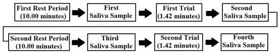 All participants took two ten-minute rests: one prior to the start of the first trial and one after collecting their second saliva sample and before participating in their second trial. After collecting their fourth saliva sample at the end of their second trial, we asked participants to respond to our experiment-specific questionnaire.