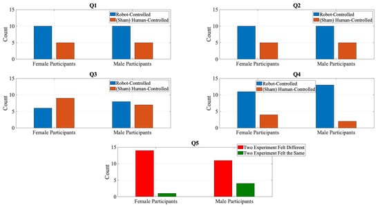 - Fifth Item Verbal Questionnaire: This item was verbally communicated with participants as they were on their way to leave the facility. Specifically, the experiment assistant asked the participants (as she was guiding them to the elevator) if they felt that their two trials (i.e., robot- and the (sham) human-controlled) were the same. We then recorded these responses as fifth questionnaire item (i.e., Q5).