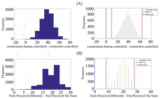 We then examined participants’ overall preference between (sham) human- and robot-controlled trials. To this end, we counted the total number of times that each participant responded by selecting “when it was controlled by the robot” versus “when it was controlled by the human” to Q1 through Q4 (i.e., collectively). We then performed a bootstrap (10,000 simulation runs) test (i.e., random sampling with replacement) on the difference between these counts (i.e., count((sham) human-controlled)-count(robot-controlled)) at 99.0% confidence interval (CI) (i.e., p < 0.01 significance level). We then considered the following null hypothesis.