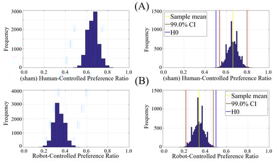 Additionally, we considered the ratio of each individual’s preference between (sham) human- versus robot-controlled trials. For this purpose, we first computed each individual’s (sham) human-controlled and robot-controlled ratios as and , respectively. For each of these ratios (i.e., separately), we then calculated its bootstrapped (10,000 simulation runs) average response at 99.0% CI (i.e., random sampling with replacement). We considered the following null hypothesis.