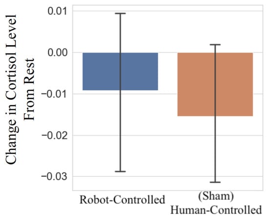 This test indicated non-significant effects of participants’ gender, operator’s gender, and their interactions (with one another as well as with respect to trail’s order). Given these observations, we discarded the participants’ gender and formed two sets of change in cortisol level: one that comprised all participants’ robot-controlled trial and the other that corresponded to their (sham) human-controlled trial. We then performed a two-sample t-test on these two sets.