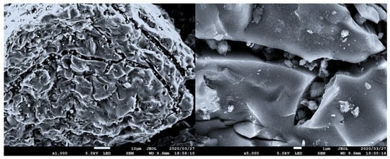 Figure 2 shows the SEM images of MSC-30. Based on the SEM observation, we estimate the mean particle size of the MSC-30 to be around 150 μm, while most of the particles can be found in the range between 100 μm to 200 μm. Figure 2 shows a detailed surface structure with visible ridges across the particles that were observable in all examples. Based on the structure of MSC-30, we can expect that these macroporous openings (>0.05 μm, IUPAC classification) will increase the diffusion rate of the adsorbate inside the particles and overall will have a positive effect on the adsorption kinetics.